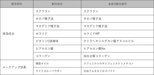 スクワラン、ホホバ種子油、マカデミア種子油、セラミド※3、ビタミンC誘導体※4、ヒアルロン酸※5、コラーゲン配合※6。