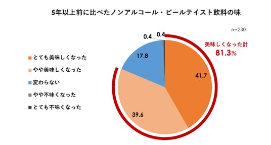 直近1年以内にノンアルコール・ビールテイスト飲料を飲んだことがあり、かつ5年以上前にもノンアルコール・ビールテイスト飲料を飲んだことがある人(230名)に、昔飲んだノンアルコール・ビールテイスト飲料と比べた最近のノンアルコール・ビールテイスト飲料の味を尋ねました。その結果、「とても美味しくなった」(41.7%)と「やや美味しくなった」(39.6%)と答えた人を合わせた「美味しくなった」計では8割を超える結果になりました。