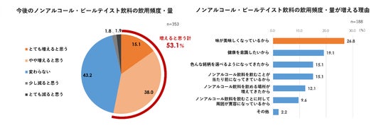 今後のノンアルコール・ビールテイスト飲料の飲用頻度・量が増えると思う人 半数以上。その理由の1位「味が美味しくなったから」