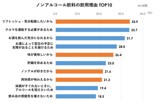 5位は「味が美味しいから」(26.4%)、7位、8位は「ノンアルが好きだから」(21.6%)、「爽快感が味わえるから」(21.2%)となっており、ノンアルコール飲料の美味しさや情緒的にもポジティブな面が飲用理由になっています。