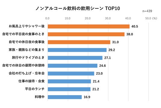 ノンアルコール飲料の飲用シーン「お風呂上りやシャワー」の後が1位