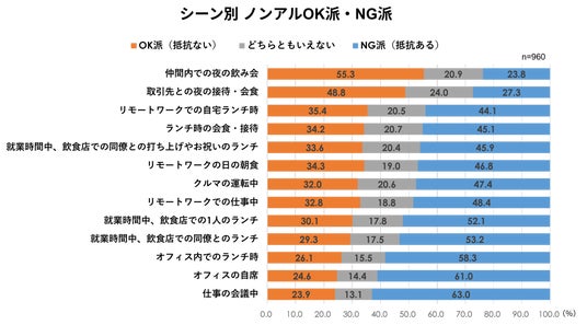 就業時間中でも、休憩時間となる飲食店でのランチシーンでは「1人のランチ」でOK派が30.1%、NG派が52.1%、「同僚とのランチ」ではOK派が29.3%、NG派が53.2%となり、飲食店でのランチは3割程度がOK派、5割強がNG派という結果になっています。