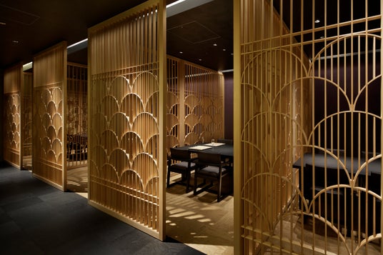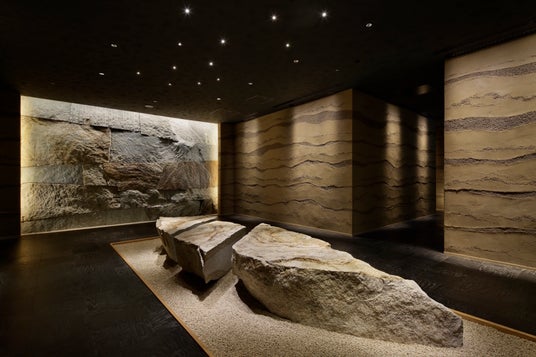 日本の伝統様式を重んじながら、現代に合わせて進化する日本旅館「星のや東京」。その地下一階にあるダイニングでは、地層をイメージした左官仕上げの壁と大きな岩が迎え入れます。エントランスを抜けると、6室の畳敷きの個室、4つのテーブル席があります。和の静けさが漂う落ち着いた日本旅館の空間で、滞在着のまま肩肘張らずに食事が楽しめます。