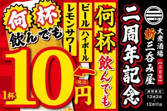 【ビールが1杯10円!生ビール・ハイボール・レモンサワーが何杯飲んでもこの価格!】オープン2周年を記念して「大衆酒場 新三呑み屋 三宮店」にて12月2日(月)~11日(水)の期間限定で実施