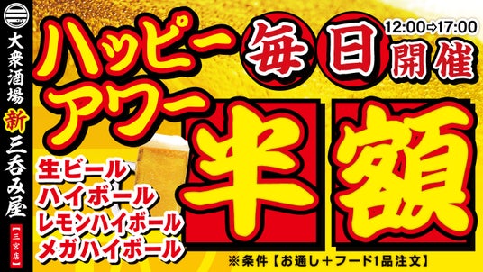 生ビール199円・ハイボール99円・レモン入りハイボール129円・メガハイボール199円を半額で提供いたします。