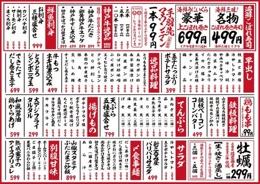 お得で幅広いジャンルのメニューをご用意しました。三呑み屋本店では提供していない播磨灘産の牡蠣、日本三大和牛である神戸牛を使ったメニュー、さらにオリジナルスパイスで作り上げた1本99円(税込109円)の手羽先は特におすすめです。