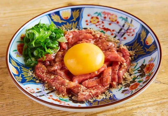 神戸牛卵黄ユッケ・・・899円(税込989円)卵黄と特製タレに絡められた神戸牛は一噛みするごとに牛肉の旨みを感じられます。