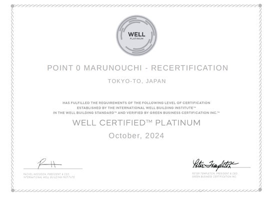株式会社point0(東京都千代田区)は、運営するコワーキングスペース「point 0 marunouchi」における「WELL Building Standard(TM) v2 (以下、WELL認証)」の2024年10月末に実施した更新審査の結果、企業間の協創/共創から生まれたソリューション等により「イノベーション」カテゴリー内の「WELLのイノベーション」項目で日本国内過去最多6点(※1)となるなどの評価向上を受け、国内のコワーキングスペースで初めて最高ランク「プラチナ」を取得しました(※2)。