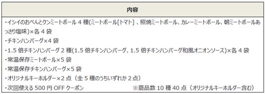 今年は、お子さまも楽しめるよう、人気商品のオリジナルキーホルダーを封入しました。ラインナップは全5種で『イシイのおべんとクンミートボール』シリーズ4種とチキンハンバーグをミニチュアチャーム化しました。ミートボールやハンバーグのソース感にもこだわり、本物そっくりの仕上がりです。全5種類のうち、『創業80周年記念』限定福袋にはいずれか2点、その他福袋にはいずれか1点封入しています。また、石井食品公式オンラインストア無添加調理専門店「イシイのオンラインストア」(https://shop.directishii.net/)にて次回お買い物の際に使える「500円OFFクーポン」の特典がつきます。