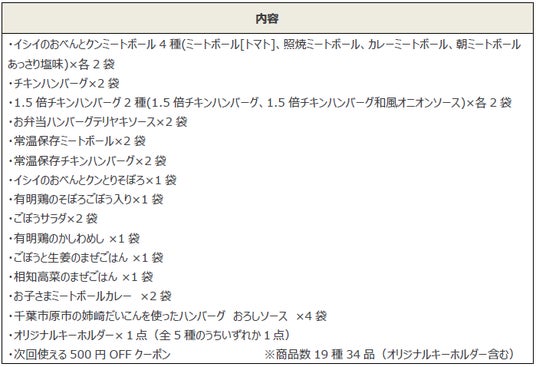 ロングセラー商品の『イシイのおべんとクンミートボール』や季節限定『姉崎だいこんハンバーグ』など人気商品・季節限定商品19種34品を詰め合せた様々な種類が楽しめるセットです。
