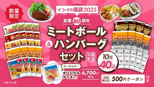 来年2025年に創業80周年を迎える石井食品の看板商品『イシイのおべんとクンミートボール』4種や『チキンハンバーグ』、『常温保存ミートボール』等を合わせた今回限りの限定福袋です。