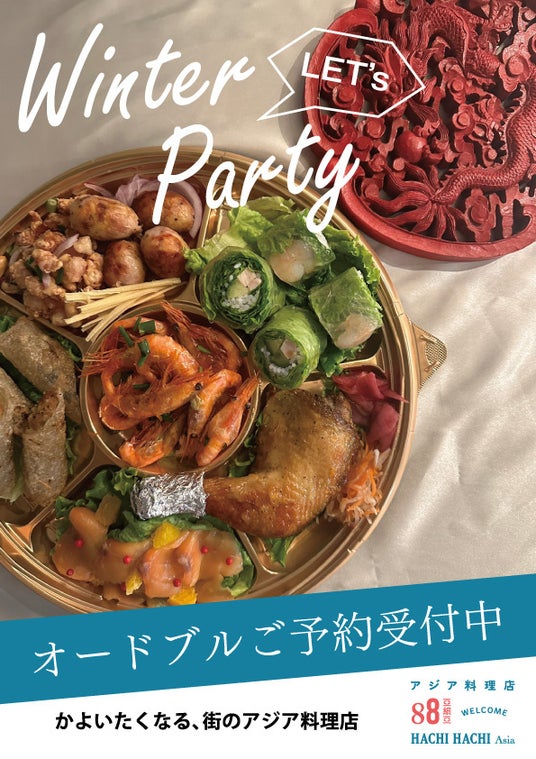 “かよいたくなる、街のアジア料理店。”をコンセプトにした『88亞細亞(ハチハチアジア)』は、年末年始のホリデーシーズン限定プラン「よくばりコース」と、お家でも88 (ハチハチ)のアジア料理をお楽しみいただける「88 スペシャルオードブル」を販売いたします。
