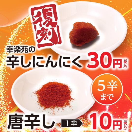 さらに、新たなトッピングメニューとして、かねてより多くのお客様から再開希望の声が寄せられていた「辛しにんにく」30円と、お好きな商品に辛みを足してお楽しみいただける「唐辛し」1辛10円を11月29日(金)から販売開始いたします。