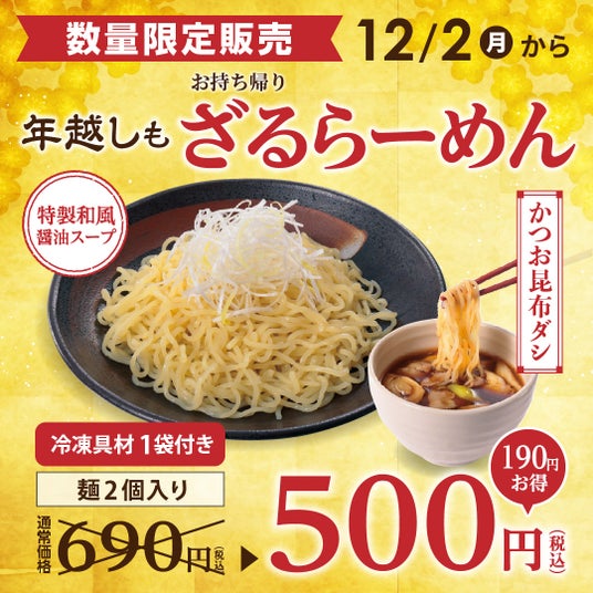 また、同日より、年越しそばの代わりとしても楽しめる、お持ち帰り「ざるらーめん」通常価格690円を、特別価格500円で販売するキャンペーンを開催いたします。