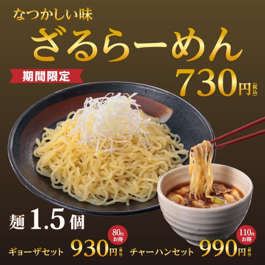 株式会社幸楽苑(本社:福島県郡山市)が運営する「幸楽苑」は、2024年12月2日(月)から期間限定として、豚バラ肉の旨みと香ばしく焼きあげたネギが香る、なつかしい味「ざるらーめん」730円を販売開始いたします。本商品には、お得なギョーザセット930円、チャーハンセット990円をご用意しております。