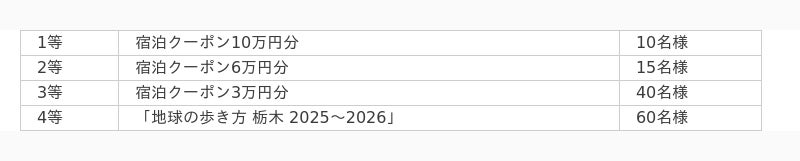 12月1日(日)~2月14日(金)の期間に栃木県内のホテルや旅館で宿泊し、本キャンペーンへご応募いただいたお客様へ抽選で、次回のとちぎ旅で使える10万円分の宿泊クーポン等をプレゼント。