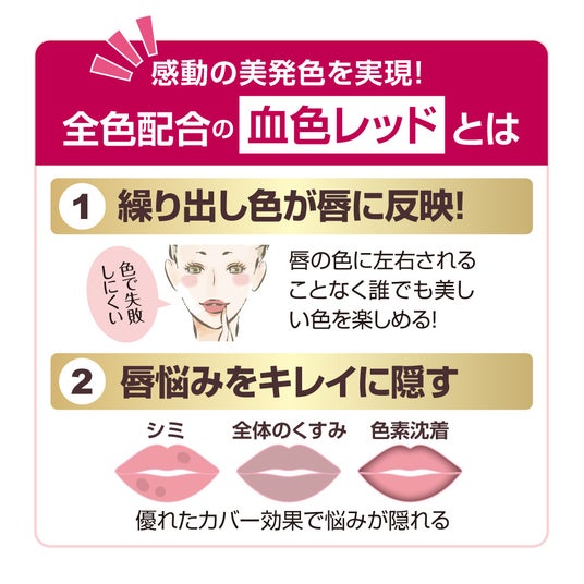唇の悩みに選ぶ色を左右されない「血色レッド」配合。