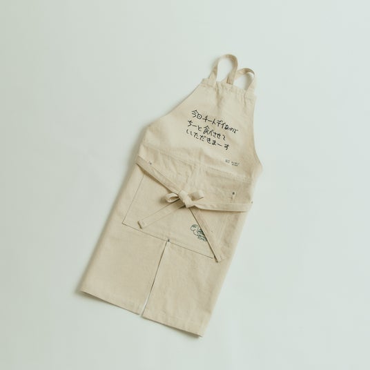 【ken kagami × TAKUNABE × FAT CLUB】のコラボエプロンになります。しっかりとした生地が特徴で、カラーは使いやすいアイボリーになります。大きなポケットと小さいポケット2つと機能性もあり、緑のTAKUNABE亀(ken kagami デザイン)の個性もきらりと光ります。胸に大胆にあしらったken kagamiの文字はインパクトがあり、これから料理をする(食べる)意気込みを感じる一品です。ファッションアイテムとしても、個性が光るコラボエプロンです。