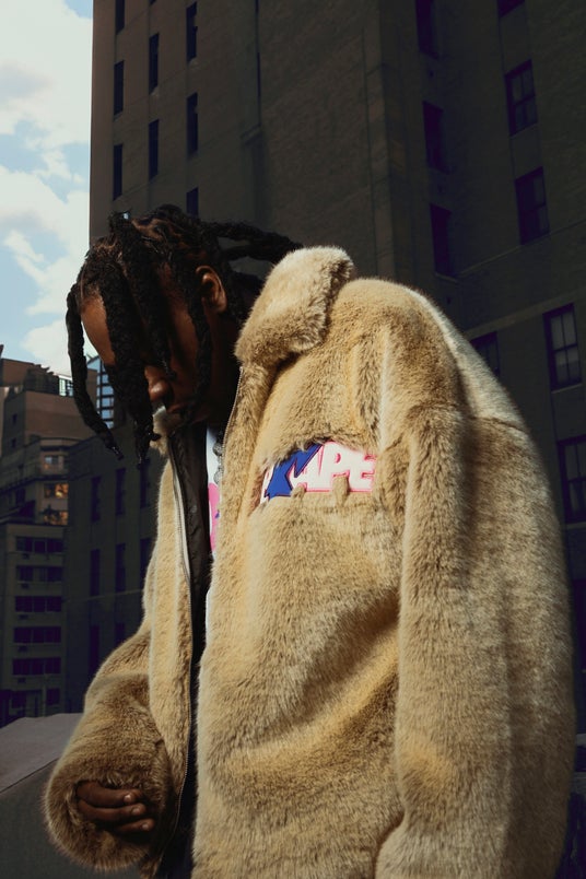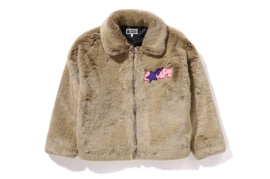 ファージャケットは、キャメルカラーのファーに、ピンクとパーブルの“BAPE(R)”と“DON”のロゴを刺繍しています。インナーにフーディを着用すればフードのファーとのアンサンブルが楽しめます。