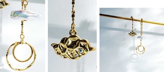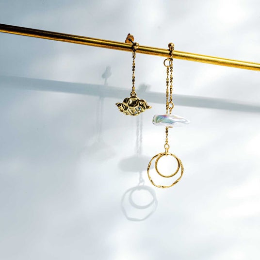 たおやかに揺れる大人のアシメトリーがおしゃれなイヤアクセサリーです。長いチェーンには虹色のオーロラのような輝き放つ雲と、光背をイメージしたリングパーツ、短いチェーンには質感のあるゴールドのメタルパーツの雲がそれぞれ耳もとでゆらめきます。