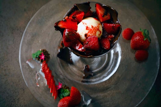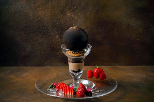 甘味が強く、程よい酸味でジューシーな味わいが特徴の和歌山県産の苺「まりひめ」を、フランボワーズ、バニラアイスとともに、濃厚で香り豊かなショコラドームの中に忍ばせてご提供いたします。お客様の目の前で仕上げの温かいベリーソースをかけると、ショコラドームが少しずつ妖艶にとろけて中から色鮮やかなフルーツが現れる、フォトジェニックな瞬間をお楽しみいただけます。