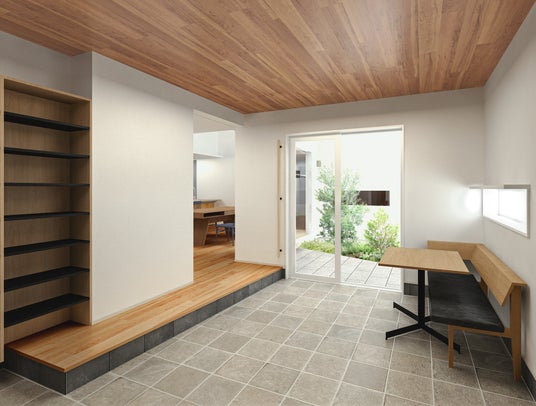 広い玄関土間は、靴を履いたまま過ごせるセカンドリビングとして多用途に活用可能。II型キッチンでは家族一緒に料理を楽しめ、対面カウンターからは中庭の景色が広がる…。
