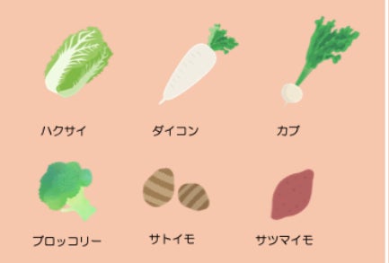 スワン(カブ)、紅はるか(サツマイモ)、総太り(ダイコン)、無双(ハクサイ)、水菜、春菊、コマツナ など