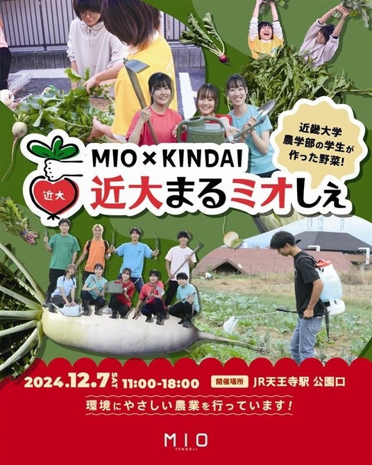 JR西日本SC開発株式会社(本社:大阪市北区梅田)が運営する大型ショッピングセンター「天王寺ミオ」は、近畿大学との産学連携として農学部の学生企画による一日限りの野菜マルシェ「近大まるミオしぇ」を2018年より開催してきました。この活動は学生達が企画から販促、運営まで全てに関与し、当社は開催場所として天王寺駅前広場の準備、販売に必要なワゴン等の貸与、サイネージを使った開催告知を実施します。