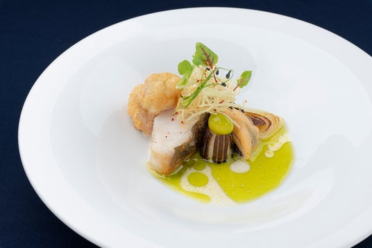 【料理名】 宮古産真鱈のブレゼと白子のベニエ しゅうり貝と林檎のソース バジルの香り