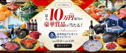 トレイダーズホールディングス株式会社(東京証券取引所スタンダード市場8704)のグループ会社で、外国為替証拠金取引事業(FX取引)等を営むトレイダーズ証券株式会社(本社:東京都渋谷区、代表取締役:須山 剛、以下「トレイダーズ証券」)は、2024年12月2日(月)より外国為替取引サービス「みんなのFX」及び「LIGHT FX」において、「冬の豪華賞品プレゼントキャンペーン」を実施することを決定しました。