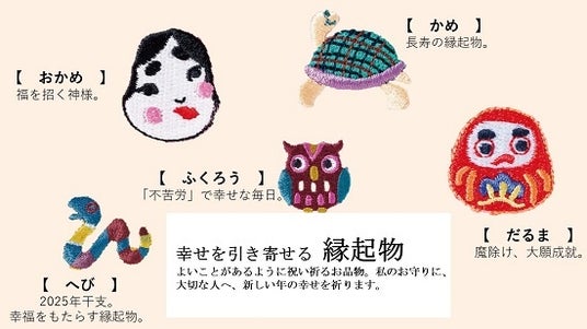 アップリケのデザインは2025年干支のへびをはじめ、だるま・ふくろう・亀・おかめなど幸せを呼ぶ縁起物でそろえました。アップリケは小さく刺繍し、シンプルな仕上がりなのでセシールのメイン顧客層である50代のお客様、さらにそのお母様世代の方も一緒に着用していただけます。