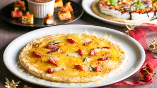 ふんだんにいちごが盛り付けられたベイクドチーズ、タルトやパイ
