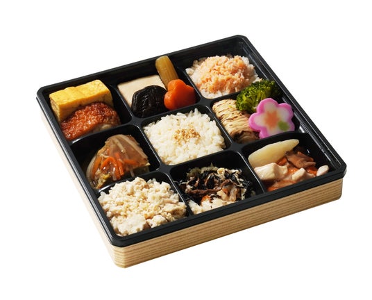 かつお節だしの魅力が詰まった冬限定のお弁当です。鯛フレークを乗せただし炊き込みご飯にだしを利かせたかぼちゃ煮などの煮物、厚焼玉子を詰め合せました。