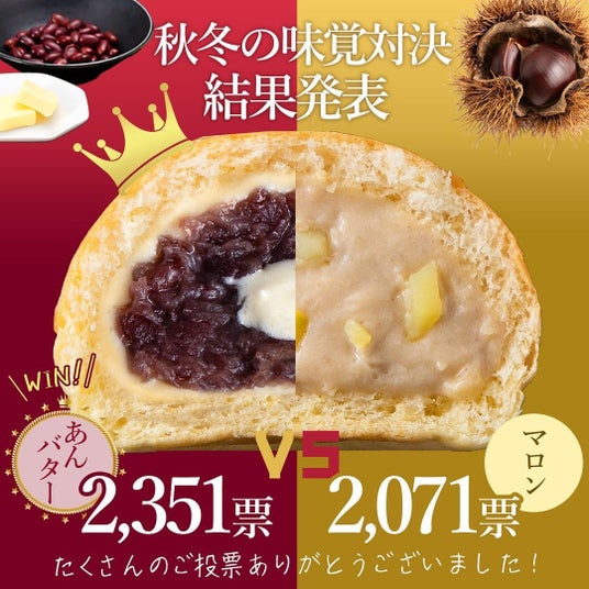 公式SNSで10月11日(金)~11月11日(月)に実施した『くりーむパンマロンVSあんバター 秋冬の味覚対決』では「あんバター」が投票数で勝利。八天堂ファンの方には人気のフレーバーです。