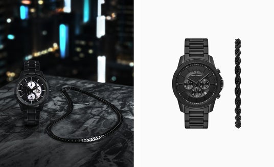 クールなブラックのステンレススチール製チェーンブレスレットと存在感のある44mm径のウォッチを組み合わせたギフトセット。ウォッチはクロノグラフムーブメントを搭載し、ブラックのサンレイダイヤルとブラックのステンレススチールブレスレットがスタイリッシュな印象を与えます。カジュアルなコーディネートの仕上げに最適です。