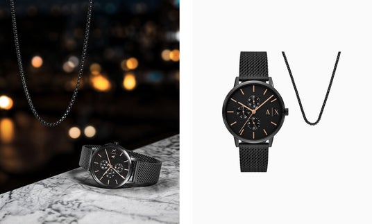 ブラックのステンレススチール製チェーンネックレスと使いやすい42mm径のウォッチを組み合わせたギフトセット。ウォッチは多機能ムーブメントを搭載し、ブラックの艶消しダイヤルとブラックのステンレススチールブレスレットが特徴です。さまざまなコーディネートでご使用頂けるのでご自身用はもちろん、ギフトにも喜ばれるアイテムです。