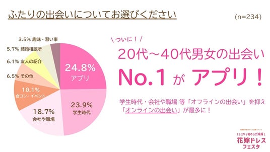 「ドレスから始める式場探し」がテーマの体感型ウエディングイベント『花嫁ドレスフェスタ(https://www.vmgfes.com/lp/dress-fes/)』を運営する、バリューマネジメント株式会社(本社:大阪府大阪市、代表取締役社長:他力野 淳、以下「バリューマネジメント」)は、令和カップルの結婚・プロポーズ事情調査として、インターネットリサーチを活用し、結婚を控える(結婚した)20代~40代の234人に向けて「結婚・プロポーズに関するアンケート」を実施しました。その結果、ふたりの出会いのきっかけ第1位が「アプリ」、次いで「学生時代」「会社・職場など」で、ついにオンラインの出会いがオフラインの出会いを超えたことが明らかになりました。