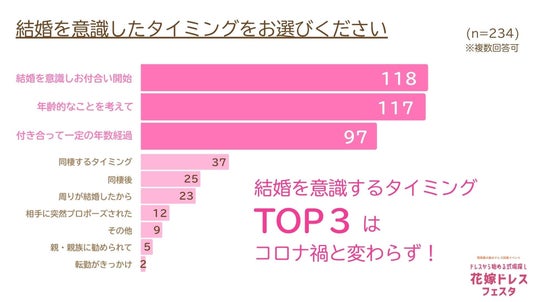 結婚を意識したタイミングTOP3はコロナ禍と変わらず、「結婚を意識しお付合い開始」「年齢的に」「付き合って一定の年数経過」に!