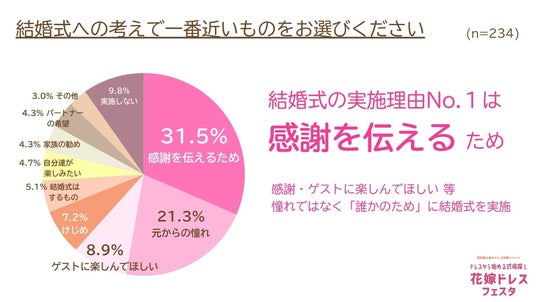 ちなみに、結婚式の実施理由についてもアンケートを行ったところ、結婚式の実施理由第1位が「感謝を伝えるため」、次いで「元からの憧れ」「ゲストに楽しんでほしい」という結果になりました。