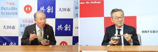 その後、大田市の楫野市長と三菱マヒンドラ農機の齋藤社長が、大田市温泉津町の椿窯で作られた茶碗に盛られた有機米を試食。平安時代の文徳天皇も「これは甘露なお米だ」と評価したという三瓶の有機米に舌鼓を打ち、「ご飯だけで食べても甘くて本当に美味しい」と顔を綻ばせました。