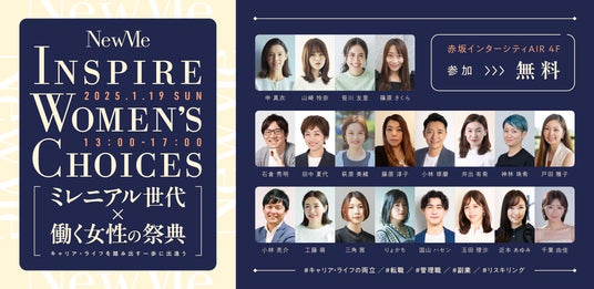 ミレニアル世代の女性のキャリアを応援するNewMe株式会社(本社:東京都渋谷区、代表取締役:篠原さくら、以下NewMe)は、「Inspire Women’s Choice ミレニアル世代×働く女性の祭典 ~キャリア・ライフを踏み出す一歩に出逢う~」と題したイベントを2025年1月19日(日)に開催します。