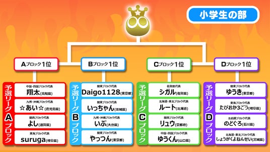 本大会は「小学生の部」「一般の部」をそれぞれ、出場選手をA・B・C・Dの4つのブロックに分け、ブロックごとにリーグ戦を行い、各ブロック上位1名が決勝トーナメントに進出します。決勝トーナメントはシングルイリミネーション方式で行われ、1回戦の組み合わせはAブロックの1位・Bブロックの1位、Cブロックの1位・Dブロックの1位となります。そして決勝トーナメントで1位となった選手がぷよぷよの日本一「全国都道府県対抗eスポーツ選手権 2024 SAGA ぷよぷよ部門」の優勝選手となります。