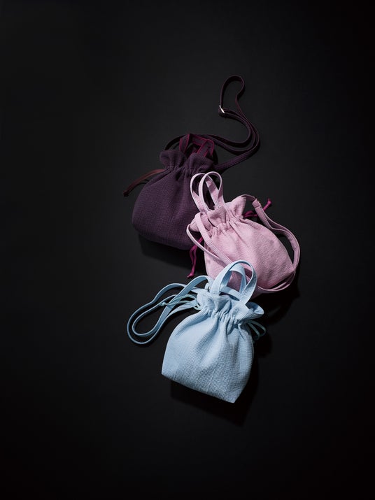 華やかなパーティーで、色とりどりのドレスをまとった貴婦人のバッグに想いを馳せて作られた巾着型バッグ。
