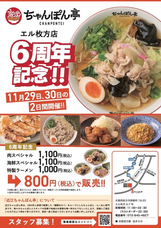 滋賀県を拠点とするドリームフーズ株式会社(本社:滋賀県彦根市、代表取締役:山本英柱)は、地域の皆様に愛される「近江ちゃんぽん亭 エル枚方店」が6周年を迎えることを記念し、感謝を込めた特別イベントを開催いたします。この2日間限定のイベントでは、人気メニューを特別価格800円(税込)でご提供。日頃のご愛顧に応える形で、地域の皆様とともにこの特別な節目を祝います。