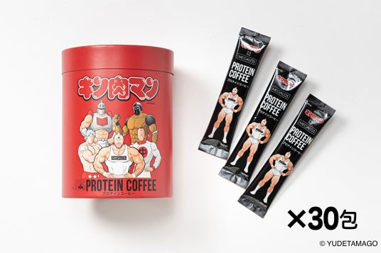 今回、キン肉マン特別パッケージ「正義超人Ver.」の PROTEIN COFFEE 30包入りタイプのほか、キン肉マンの「KINマーク」デザインのタンクトップ入りの限定版10包入りタイプも数量限定にて展開します。