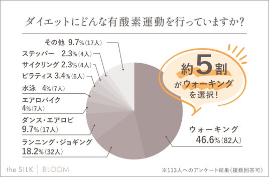 実際にどんな有酸素運動を行っているか調査したところ、ウォーキングが半数を占める結果となりました。