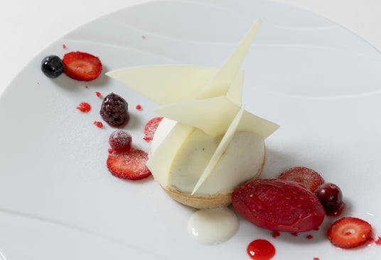 結婚式という日に相応しく、そしてコース料理の締めくくりに印象的で華やかな一皿となるように、味はもちろん見た目や色合いに重きを置いて、どのような素材をどのようにアレンジするか吟味しデザートを考案しています。