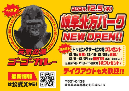 株式会社ゴーゴーカレーグループ(本社:石川県金沢市、CEO兼代表取締役社長:西畑誠、以下 ゴーゴーカレー)は、2024年12月5日に岐阜県初出店となるゴーゴカレー岐阜北方パークをオープンします。