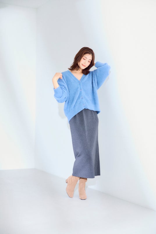 ふわっと表情のあるフェザー素材のカーディガンに、同じくニットでも素材感の異なる、適度にハリ感のあるスカートをコーディネート。ニット合わせでも、上下アイテムで風合いを変えることでメリハリが生まれます。