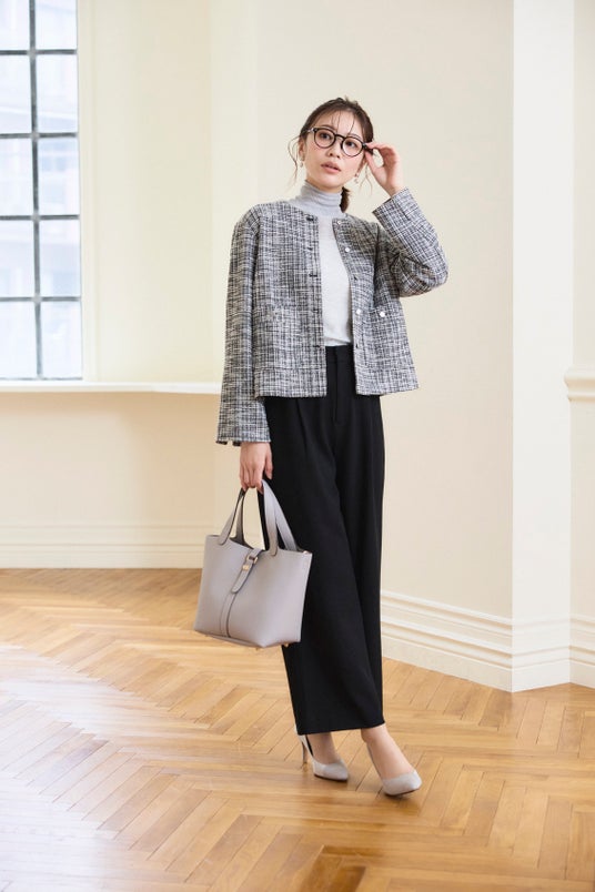 素材感でも色味でもポイントになってくれるツイードは、メリハリコーデに重宝します。タートルニットとワイドパンツのモノトーンコーデに、金釦が上品なツイードジャケットをプラスすれば、全身に統一感が生まれ、一気にスタイルアップ。